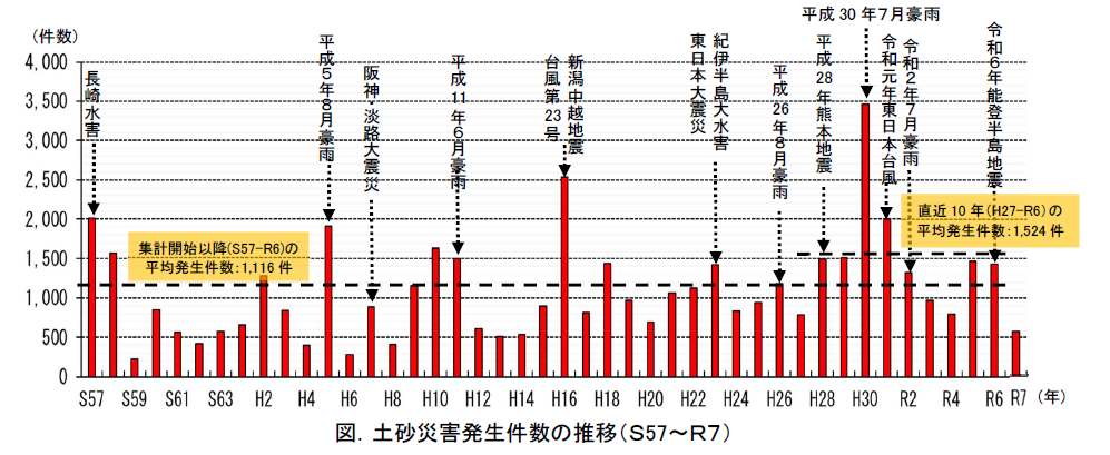 梅雨期の少雨傾向が影響し、集計開始以降(S57~R6)の平均発生件数(1,116 件)を下回る水準でしたが、8月6日からの大雨による被害のほか、火山噴火や林野火災後の荒廃流域からの土砂流出による被害など、多様な現象の影響による土砂災害が発生しました。※ 土石流等、地すべり、がけ崩れ。ただし火砕流は除く。